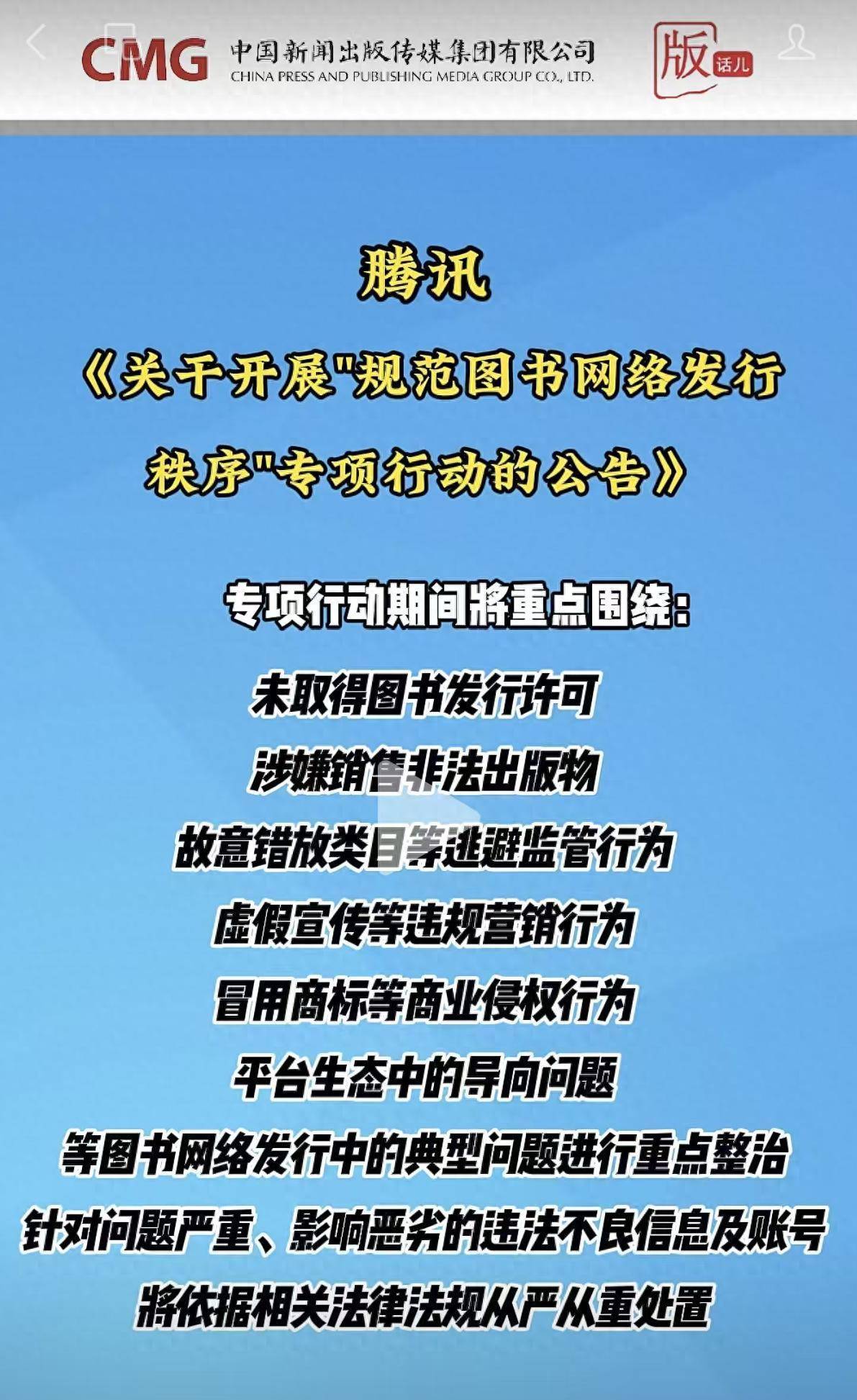 一、腾讯《关于开展"规范图书网络发行秩序"专项行动的公告》