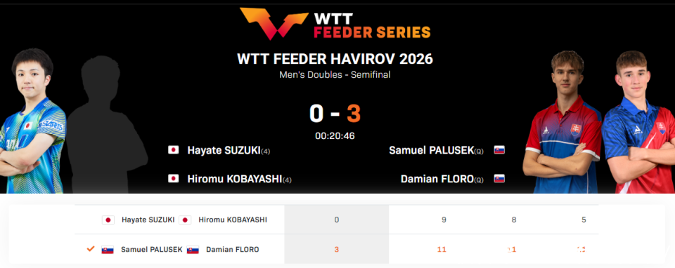 北京时间4月18日消息,2026年WTT哈维若夫支线赛继续进行。男子双打半决赛,日本组合铃木飒/小林広夢以0-3被斯洛伐克组合达米安-弗洛罗/塞缪尔-帕卢塞克淘汰出局,无缘决赛。另一场半决赛,中国香港组合陈颢桦/姚钧涛以3-2险胜晋级决赛。