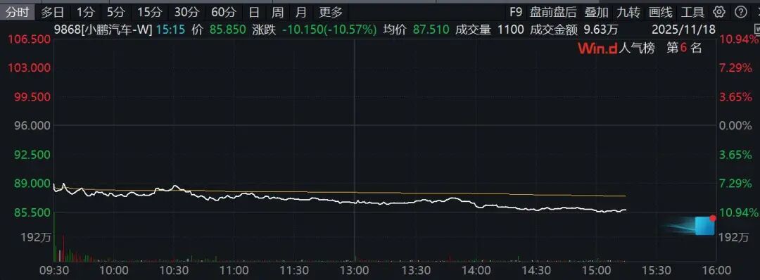 11月18日,小鹏汽车港股盘中跌近11%,最低至85.5港元。港股新能源车企同步下跌,零跑汽车、蔚来、长城汽车、理想汽车跟跌。