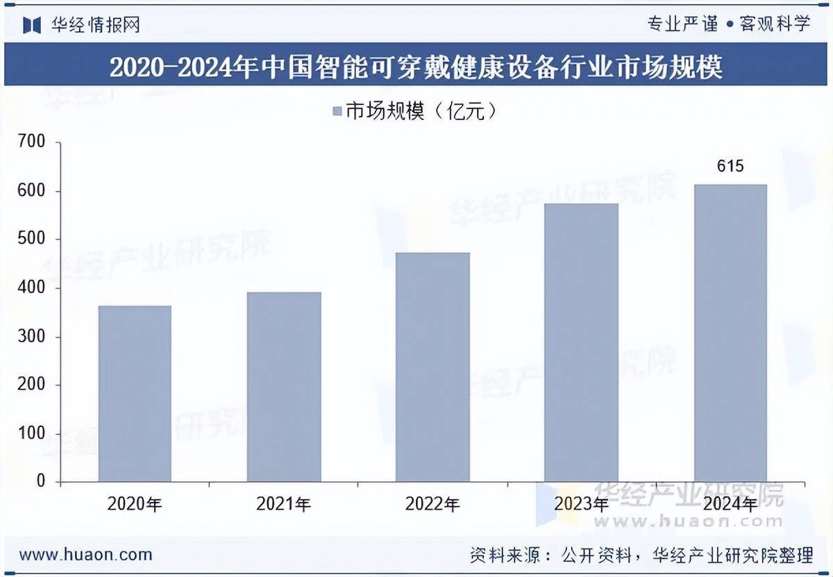 2024年中国智能可穿戴健康设备行业市场规模达615亿元,2019-2024年复合年增长率达14.7%,展现强劲增长韧性。这一市场规模得益于多重利好叠加:后疫情时代健康管理需求持续释放,医疗级功能设备获政策支持与二类医疗器械认证,AI算法、高精度传感器等技术赋能产品升级。叠加部分省市“以旧换新”补贴政策刺激,行业实现量价齐升,成为健康消费领域的核心增长极。